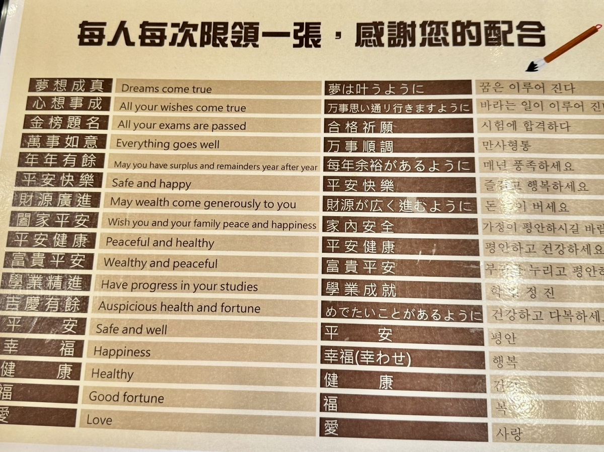 学業成就を祈る人達が多く参拝に訪れる孔子廟では、「祈福卡(チーフーカー)」というお札をいただくことができるのをご存じですか?リストの中から自分の好きな言葉を選ぶと、ボランティアの方が見事な書を記してくれます。日本語の説明があるのもありがたいですね。